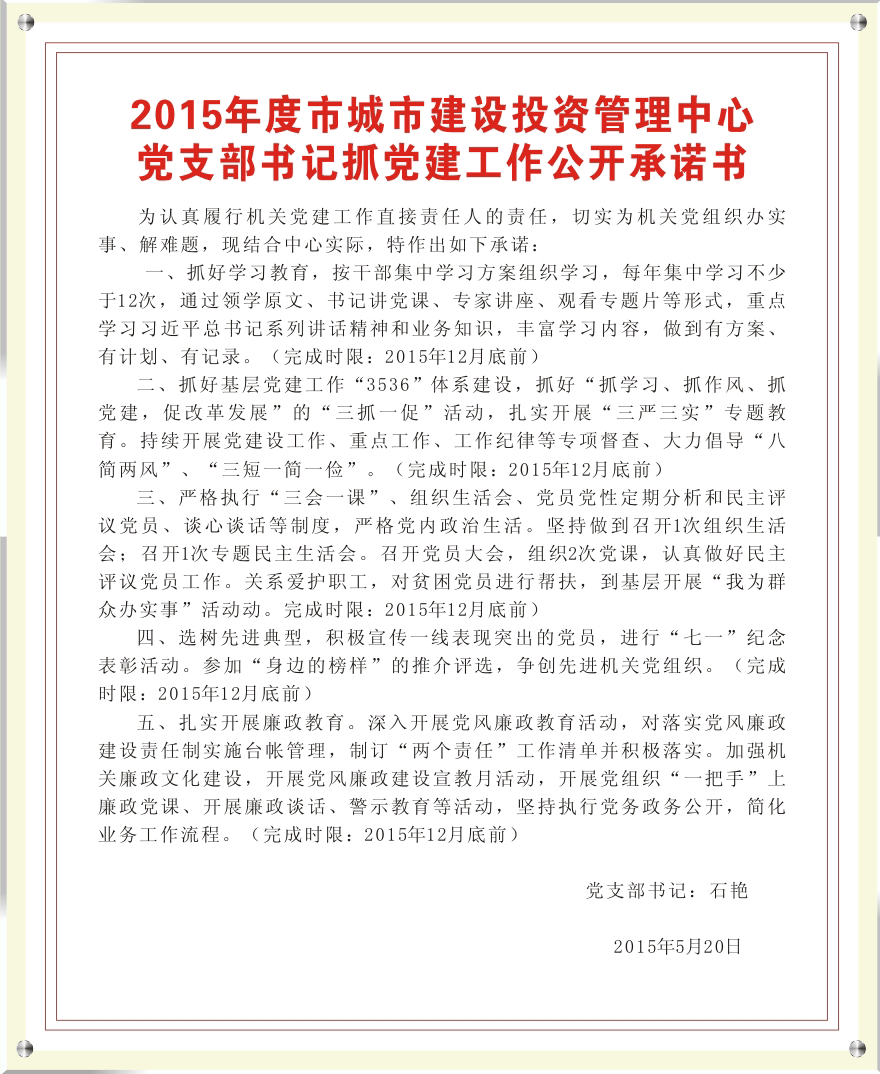 2015年度市城市建設(shè)投資管理中心黨支部書(shū)記抓黨建工作公開(kāi)承諾書(shū)